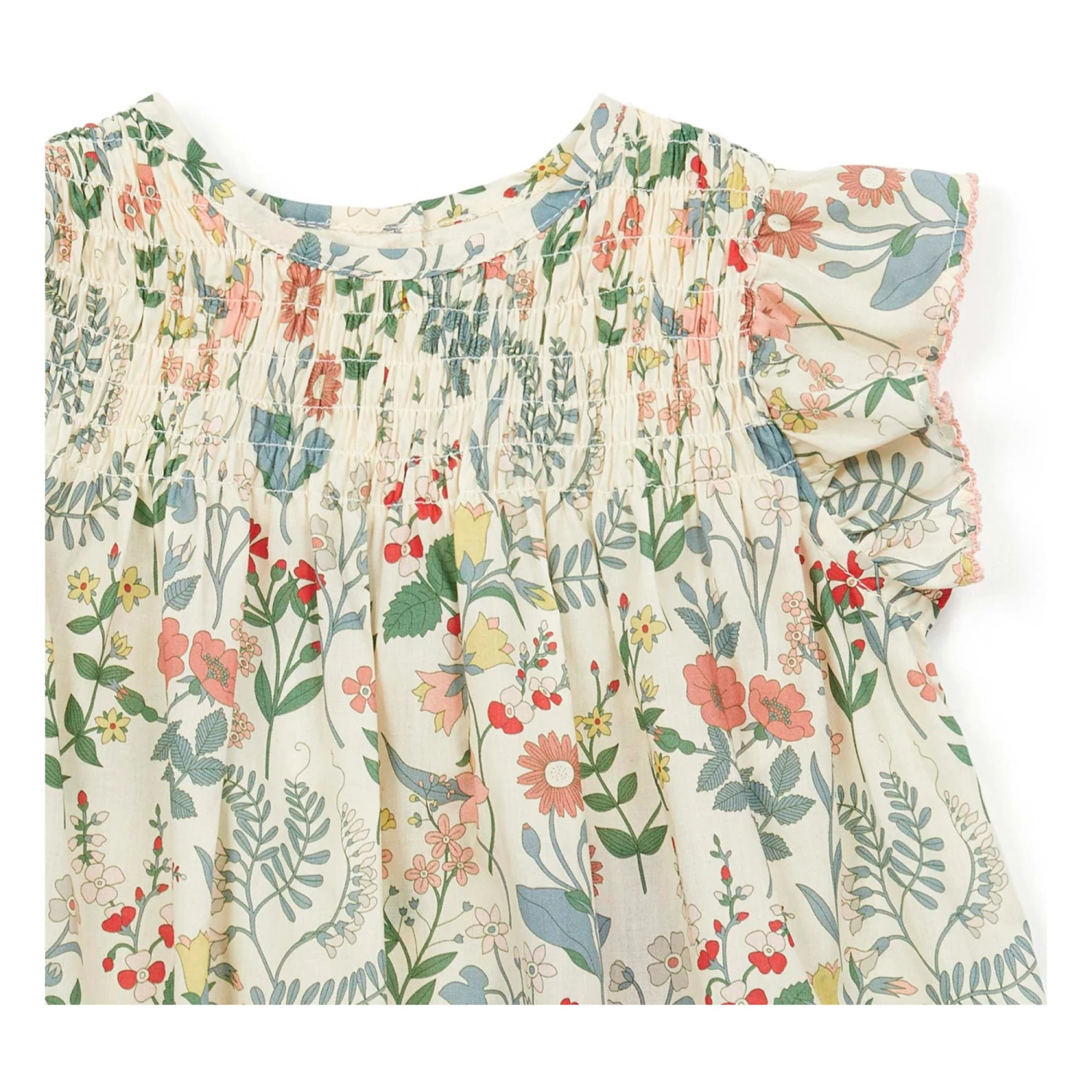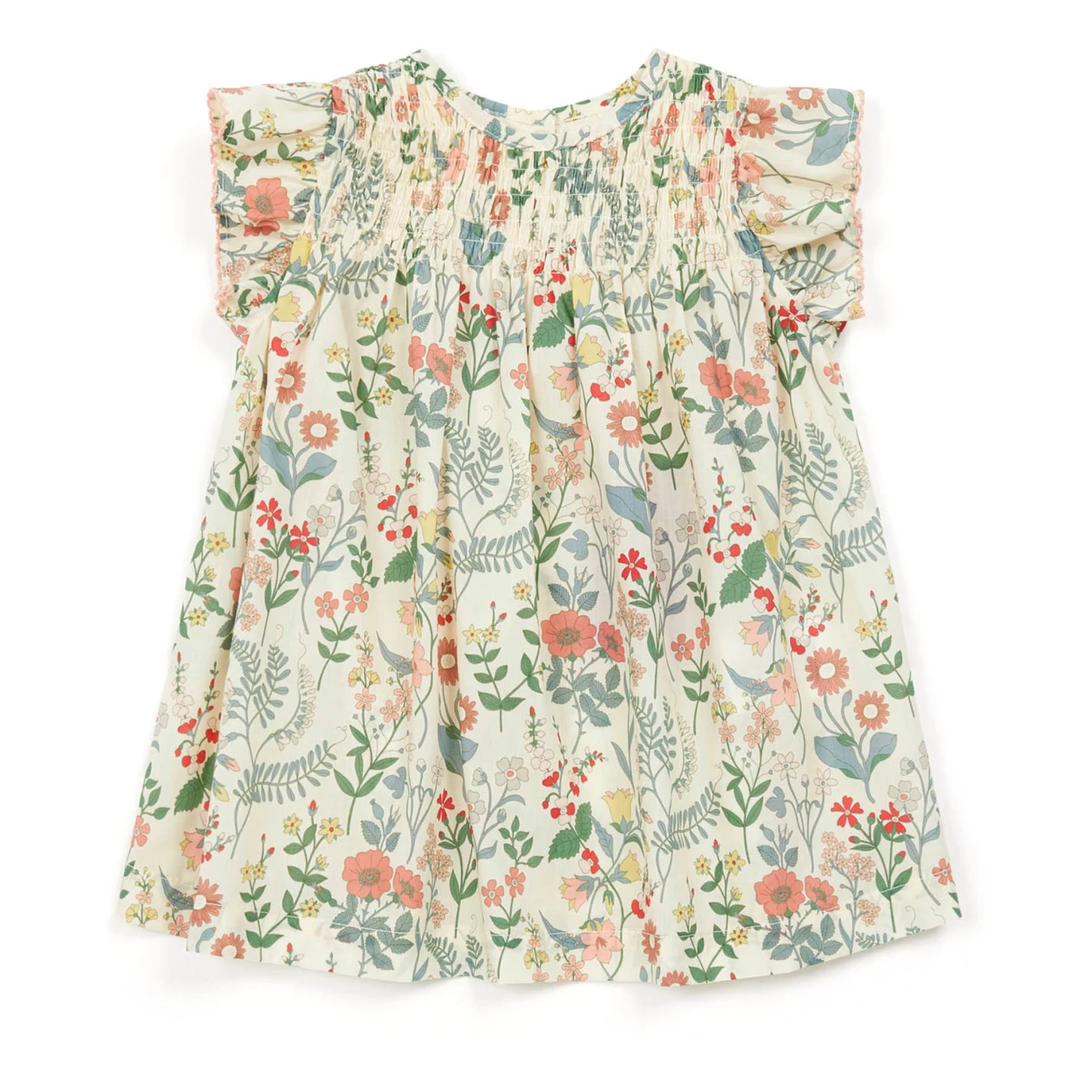 - Ruffle front, Flounce sleeve, Gathered at the back, Gathered armholes, Crew neck, Smocked shirtfront, Top stitched edges